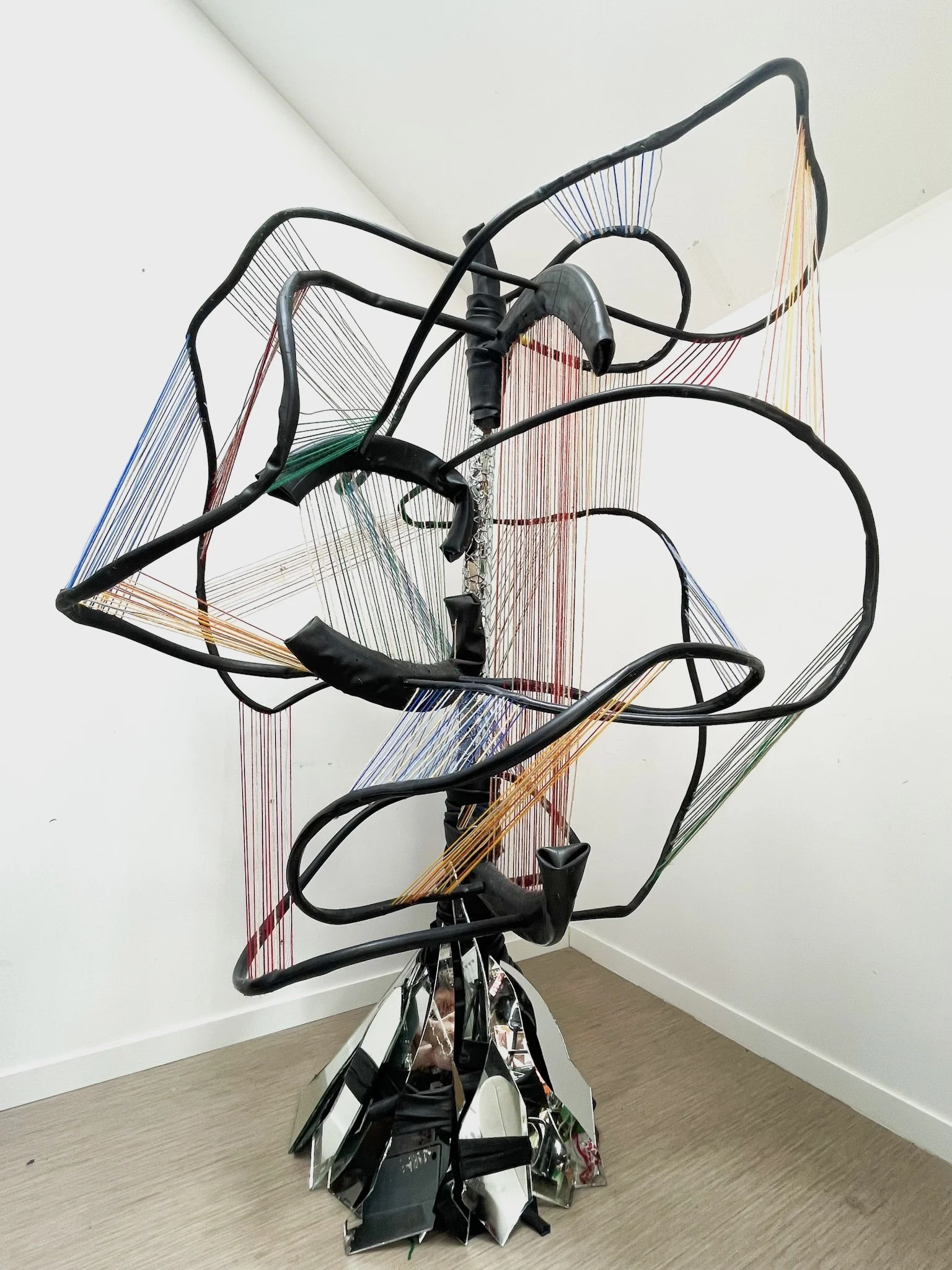 Rooting Through the Break, 2025 130cm x 205cm x 125cm Wood, rubber, mirror, thread